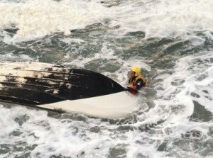 Curry County rescue swimmer Joe Martin checks out the overturned hull of a 21-foot Boston Whaler that capsized during the weekend near the mouth of the Rogue River at Gold Beach. Both commercial fishermen aboard the boat lost their lives. Photo courtesy of Curry Co Sheriff's office.